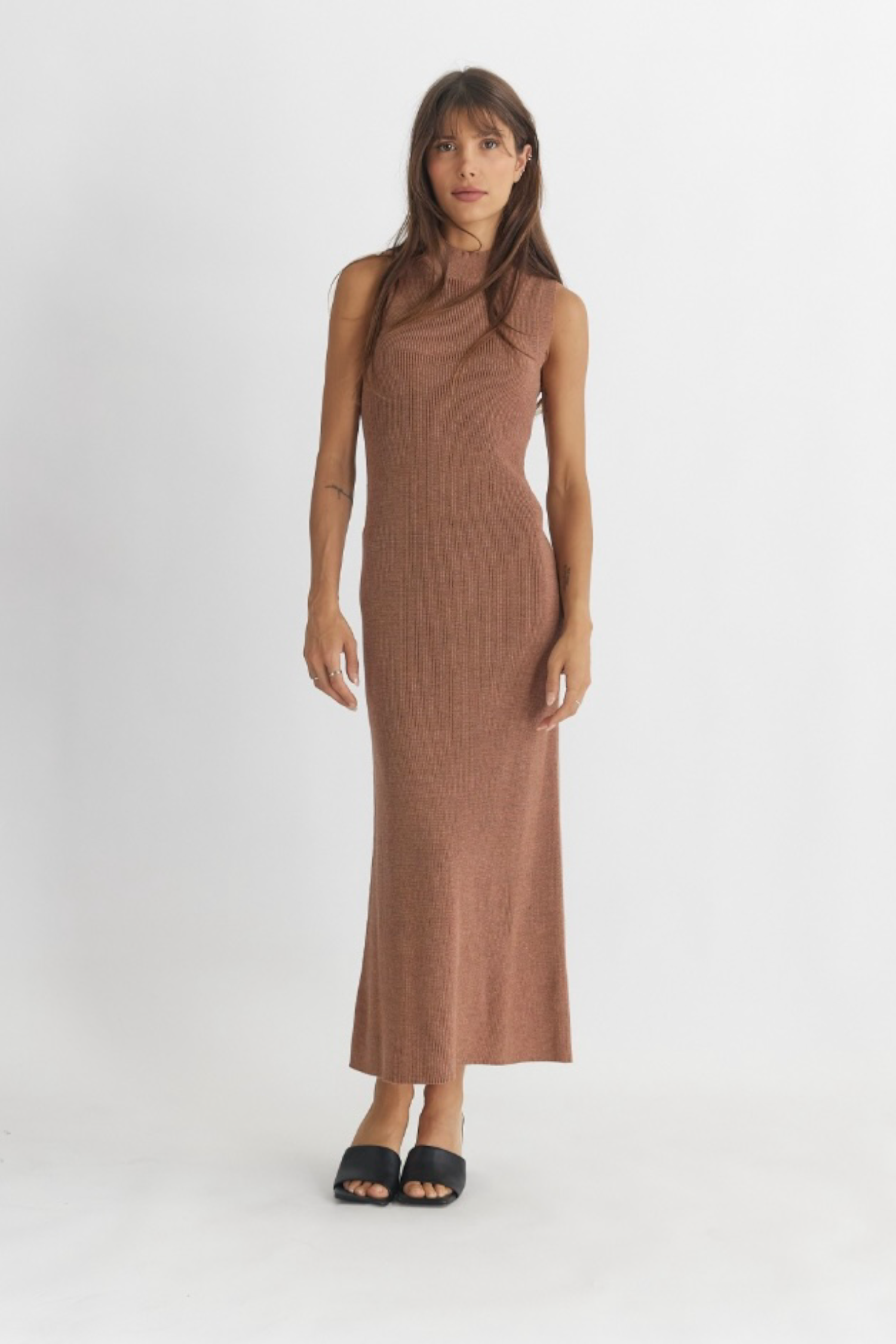 A sleeveless, mock neck dress detailed with ribbed trims. This is the perfect piece for fall and is great for layering as it reaches toward colder moments in the season.