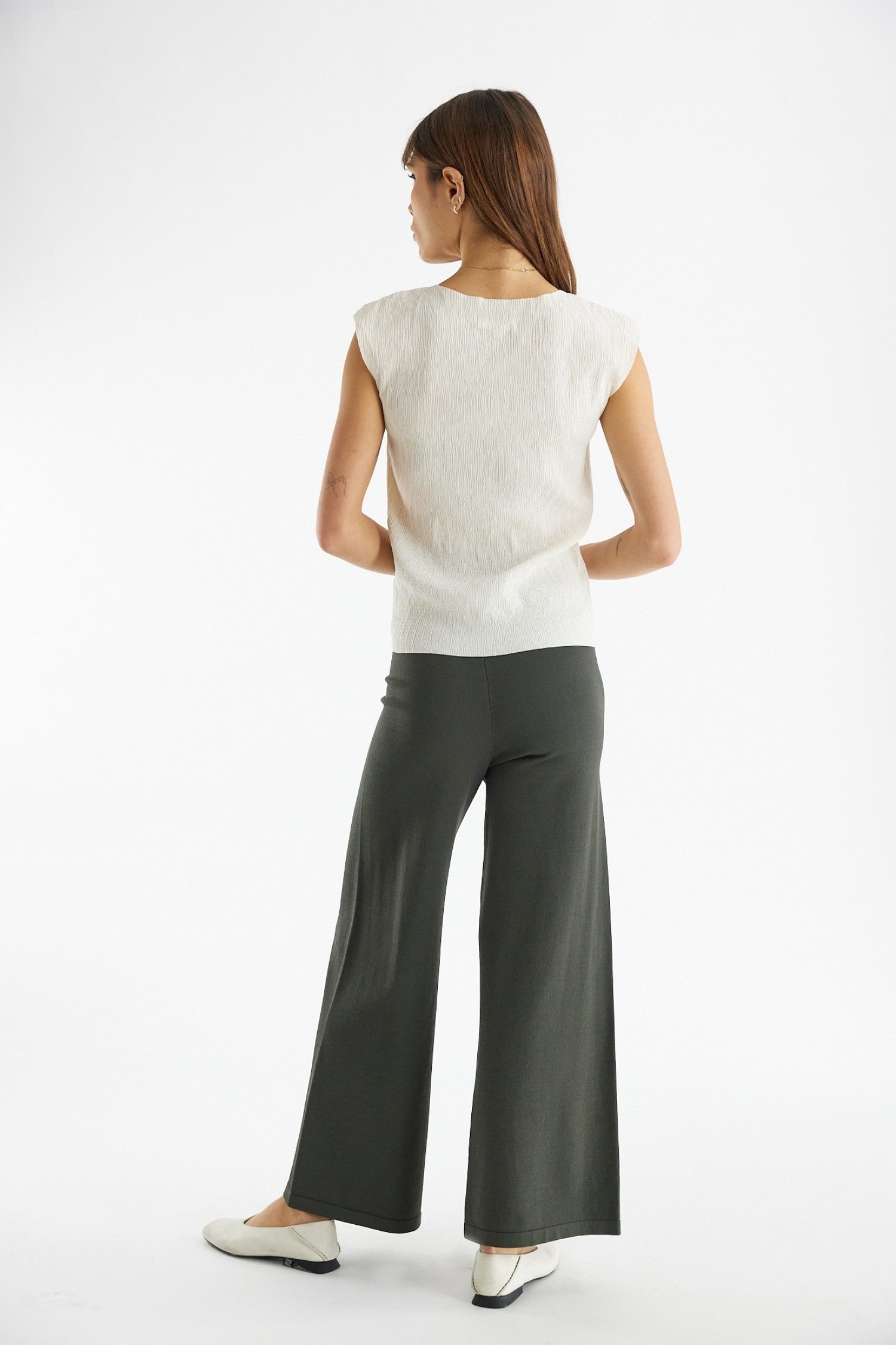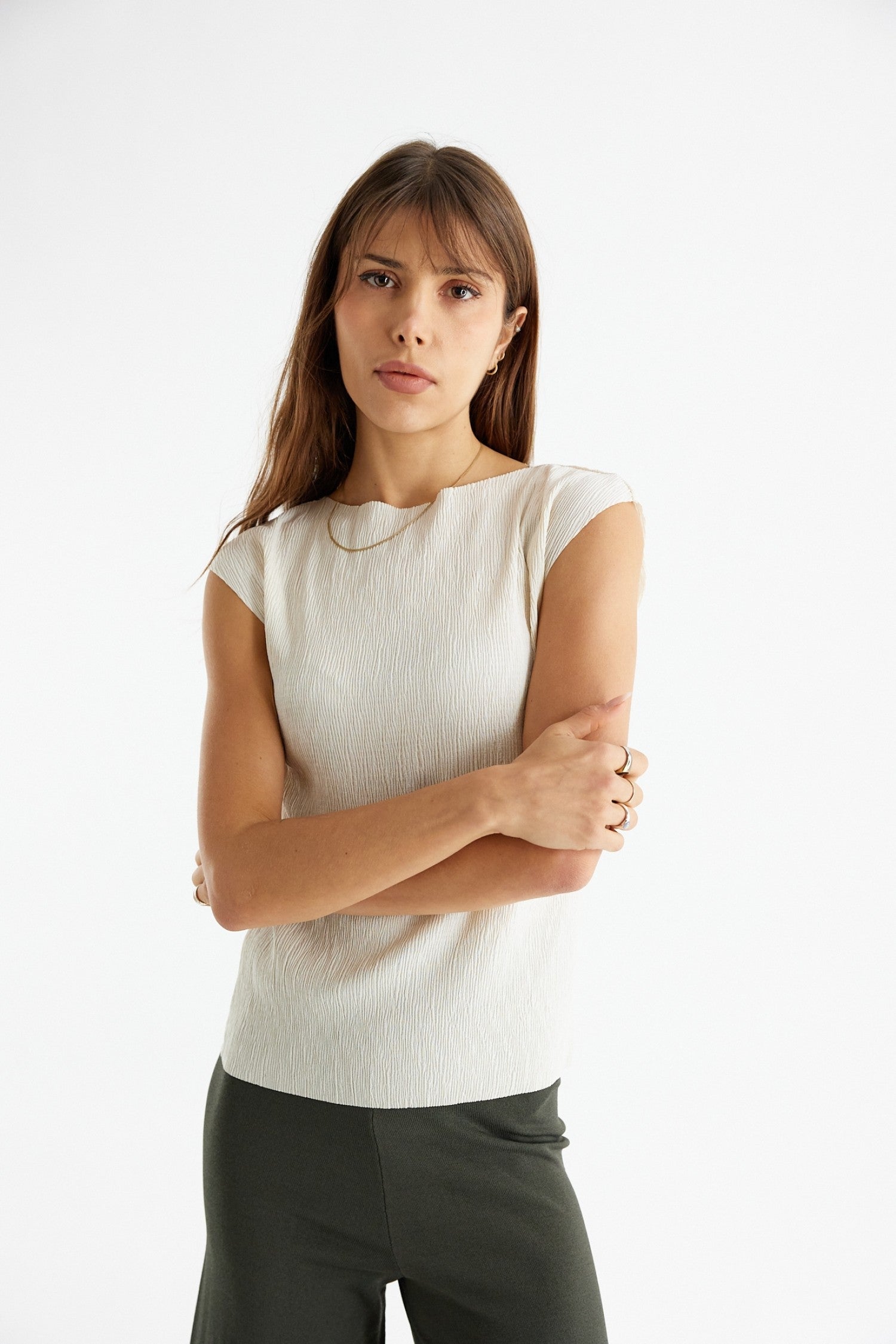 This short-sleeve top is made from a light-weight crinkled plisse fabric and will hug your body in the right places. It's detailed with a boat neckline and laser cut edges that is easy to style with just about any bottoms.