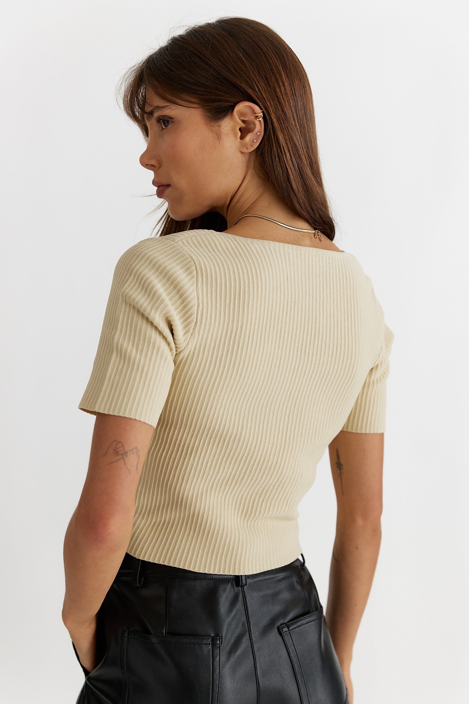 The short-sleeve, stretch knit top is an everyday style featuring a square neckline for a modern touch. Its fit to bodice silhouette and slightly cropped length make it the best piece for layering.