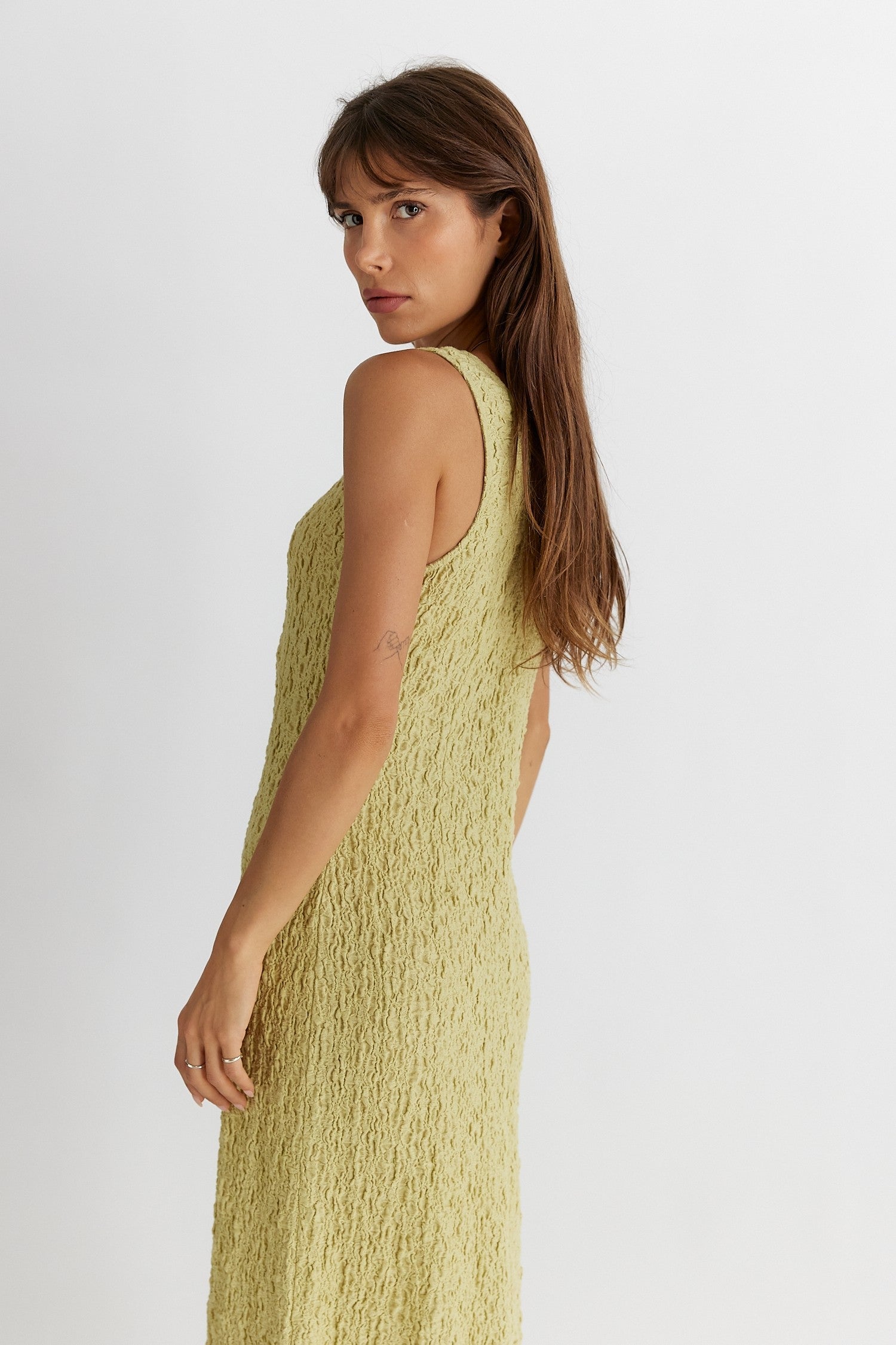 This dress is a staple piece to add to your wardrobe. This lovely limoncello dress is cut from a soft, popcorn-textured crushed fabric and features a scooped round neck and side slit. Dress it up with a pair of heels or wear it casually with a pair of boots.