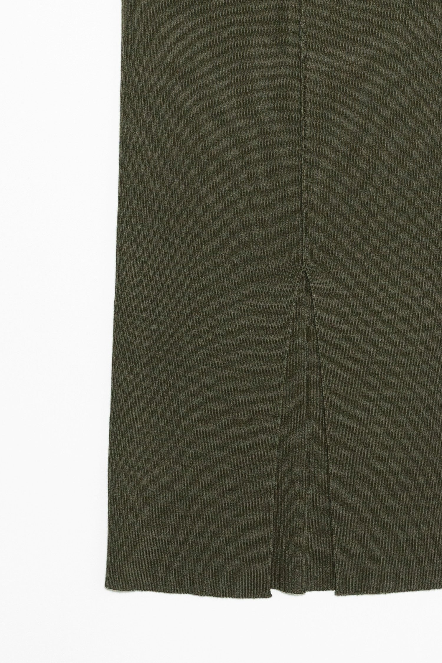 This versatile midi body-con dress features a sophisticated silhouette with short sleeves, single back slit and a subtle sweetheart neckline. Made from a rib knit fabric with high stretch, this deep olive dress is perfect for all seasons.